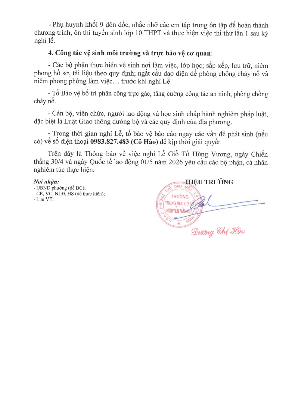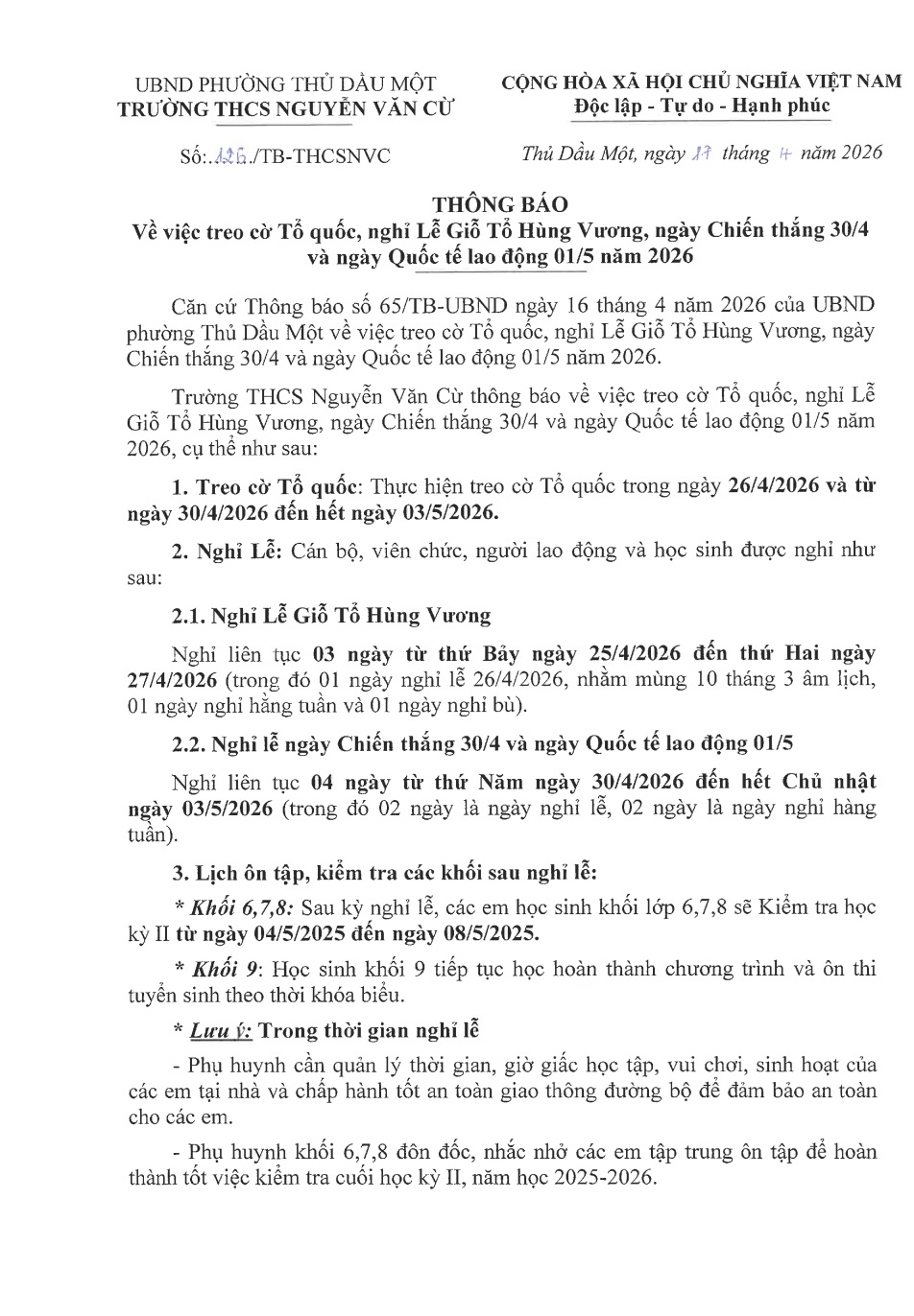 Trường THCS Nguyễn Văn Cừ thông báo Về việc treo cờ Tổ Quốc, nghỉ Lễ Giỗ Tổ Hùng Vương, ngày Chiến thắng 30/4 và ngày Quốc tế lao động 01/5 năm 2026