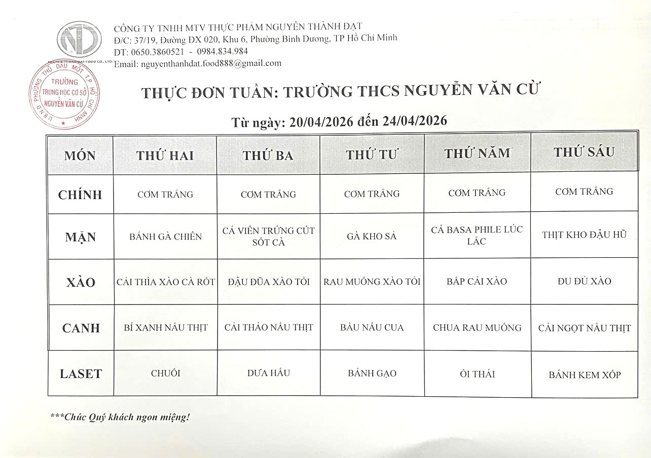 Trường THCS Nguyễn Văn Cừ thông báo Thực đơn bán trú tuần 33 từ 20/04 đến 24/04/2026. Trân trọng!