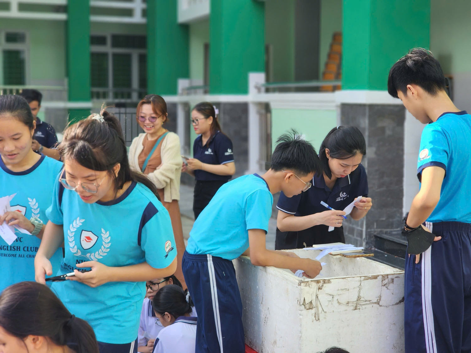 Cô Thanh Hoài - Đại diện trung tâm Anh ngữ Nghị Anh và các em học sinh trong CLB tiếng Anh cùng kiểm tra đáp án.